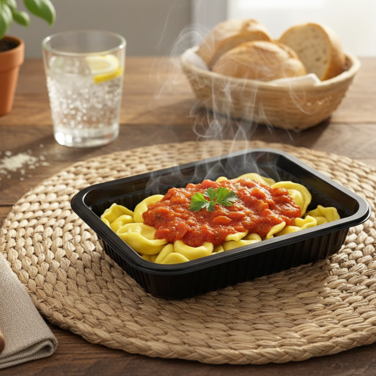 Ingredientes: Molho vermelho ingrediente (tomate italiano, molho de tomate, alho poro, cebola, alho descascado, sal e pimenta do reino) e capelete de queijo ingrediente (capelete de queijo).