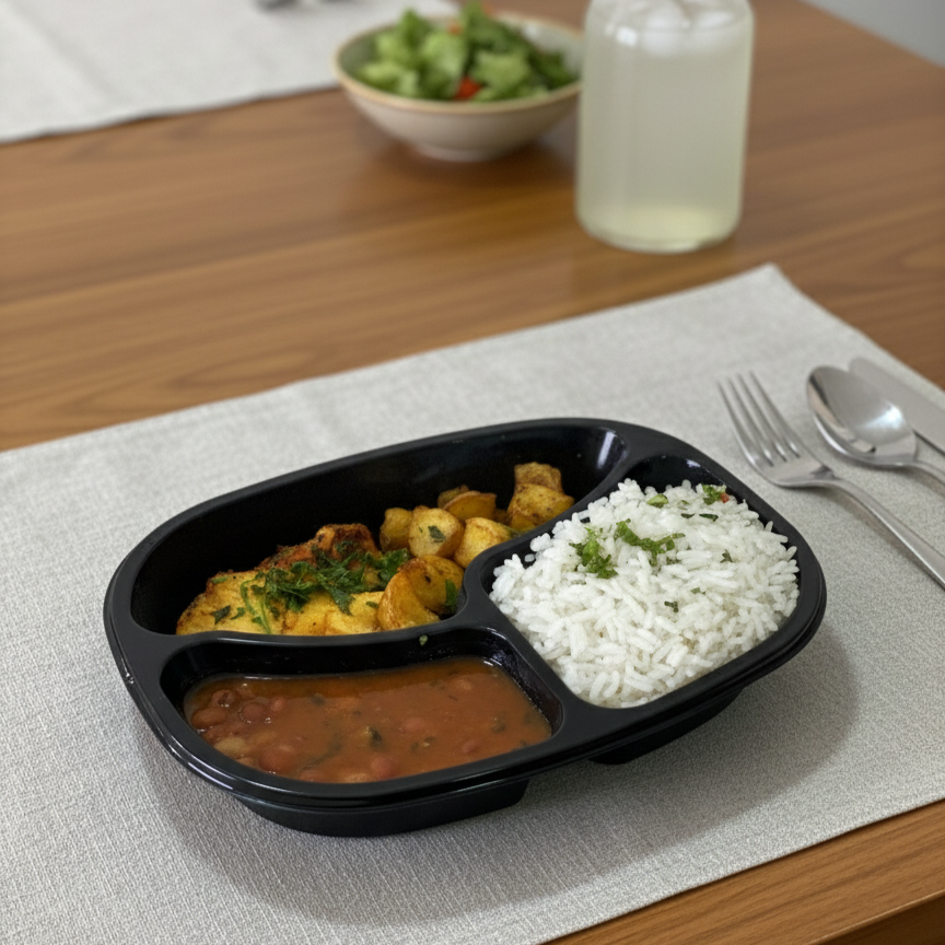 Ingredientes:Arroz branco cozido (água, arroz, arroz parboilizado, óleo de soja soya, alho descascado, alho-poró, sal e margarina), feijão carioca, filé de frango empanado ingrediente (file de peito sem osso, ovo de galinha, farinha de rosca, farinha de trigo, sal, pimenta do reino e paprica defumada), batata rústica (batata , óleo de soja soya, sal e páprica defumada) e agua filtrada.