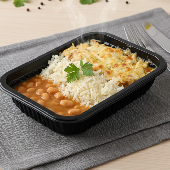 Ingredientes: Fricasse de frango (file de peito sem osso, milho, cenoura, batata monalisa , cebola, alho poro, leite integral e mussarela), arroz branco cozido (água, arroz, arroz parboilizado, óleo de soja, alho descascado, alho-poró, sal e margarina) e feijão carioca cozido (água, feijão carioca, salsa, óleo de soja, alho descascado e sal).
